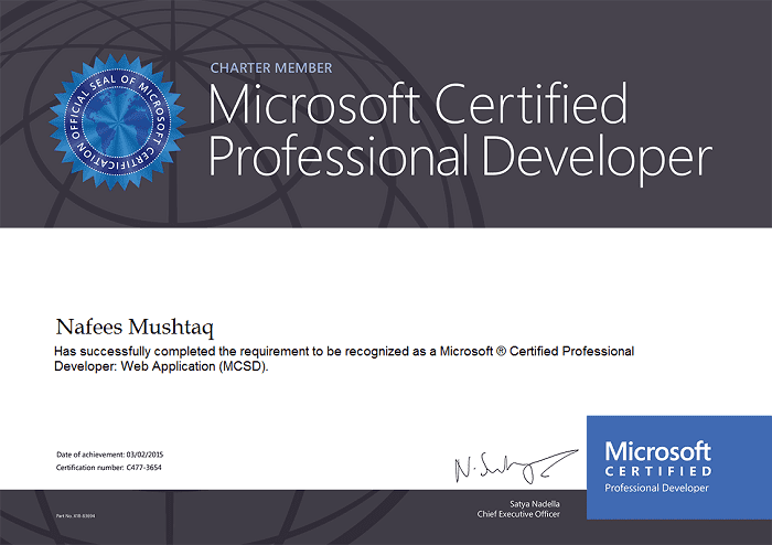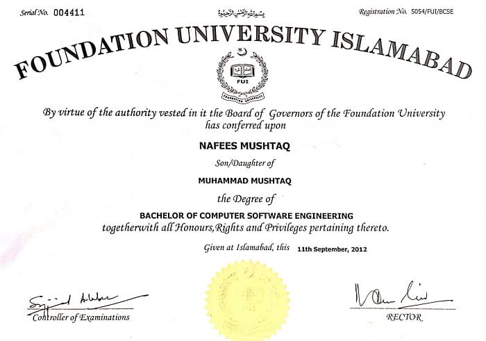 I got BCSE (Bachelor of Computer Software Engineering) degree from Foundation University, Islamabad and also I am a certified microsoft solutions developer.